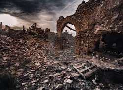 The village of Belchite was destroyed during the Spanish Civil War, but instead of reconstructing it, Francisco Franco forced the inhabitants to move out and build a new village next door. The old town was abandoned, so that the desctucted buildings may stand as a reminder to the power of Nationalism and Army.