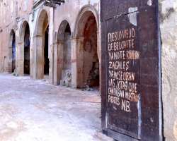 - Towards the end of the main street is the church or the "Iglesia". On the doors are the words,"Pueblo viejo de Belchite ya note rondan zagales ya no seoiran Las jotas que cantaban Nuestro padres. Which translates to," Old village of Belchite, young men won't come here anymore, you won't hear las jotas that our parents used to sing.